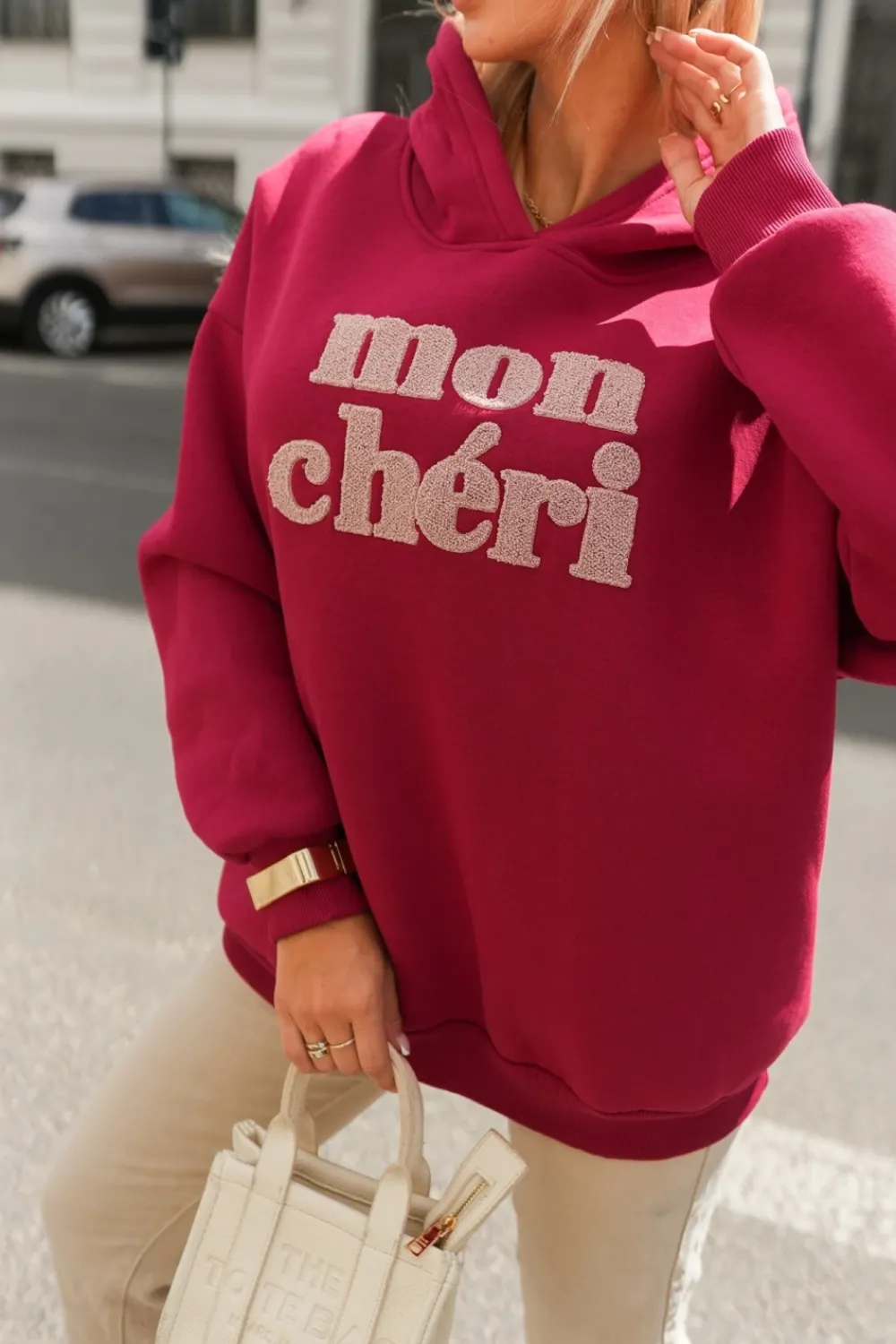 Bluza oversize z kapturem, wykonana z ocieplanego materiału, zapewniającego komfort i ciepło. Na środku znajduje się miękki, frotowy napis „mon cheri”, który dodaje uroku. Model z klasycznymi ściągaczami przy rękawach i na dole. Idealna do codziennych, luźnych stylizacji.