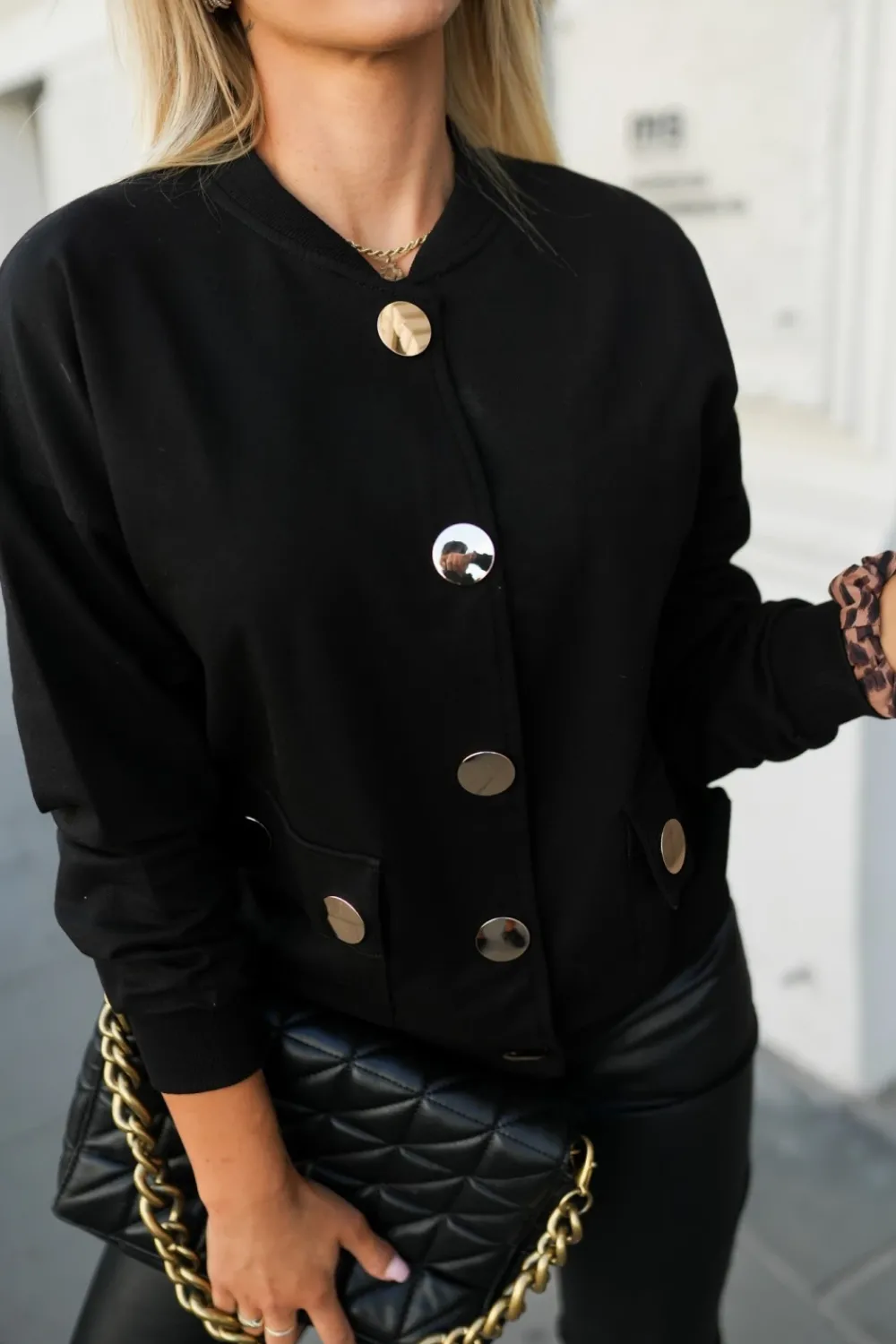 Bluza bomberka o nowoczesnym, a jednocześnie ponadczasowym kroju. Zapinana z przodu na duże, złote napy, które stanowią elegancki akcent i przyciągają uwagę. Wyposażona w stójkę oraz kieszenie z przodu z patkami zapinanymi również na napy, co dodaje jej charakteru i funkcjonalności. Dół oraz długie rękawy zakończone są ściągaczem, dzięki czemu bluza świetnie układa się na sylwetce i zapewnia wygodę noszenia. Idealna propozycja do casualowych stylizacji z nutą elegancji.