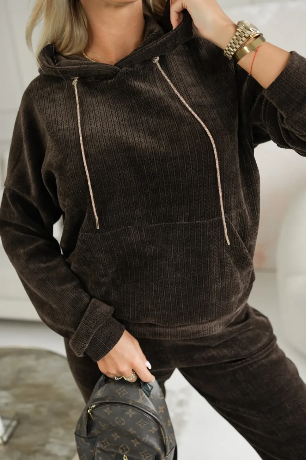 Bluza wyróżniająca się tłoczonym wzorem na materiale. Kaptur posiada ozdobne troczki oraz praktyczną kieszeń typu kangurka, co nadaje jej sportowego charakteru. Świetnie sprawdzi się zarówno na co dzień, jak i w luźniejszych, miejskich stylizacjach.