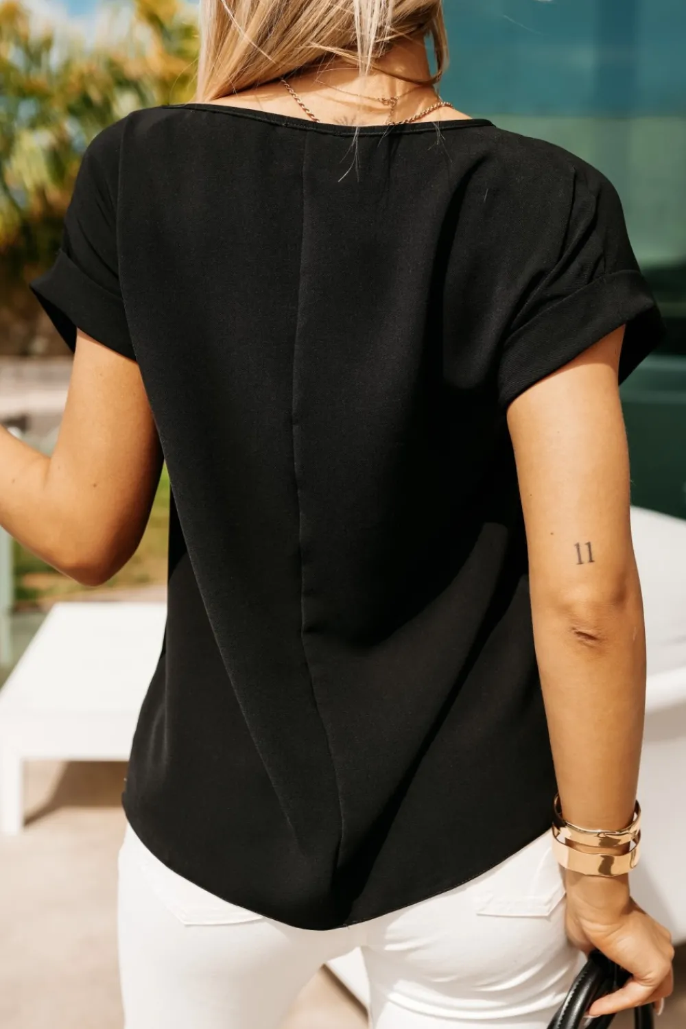 Elegancka bluzka o prostym kroju. Posiada dekolt w łódkę oraz krótki rękaw zakończony podwinięciem. Wykonana jest z dobrej jakości, mało elastycznego materiału. Pasuje zarówno do stylizacji formalnych jak i casualowych.