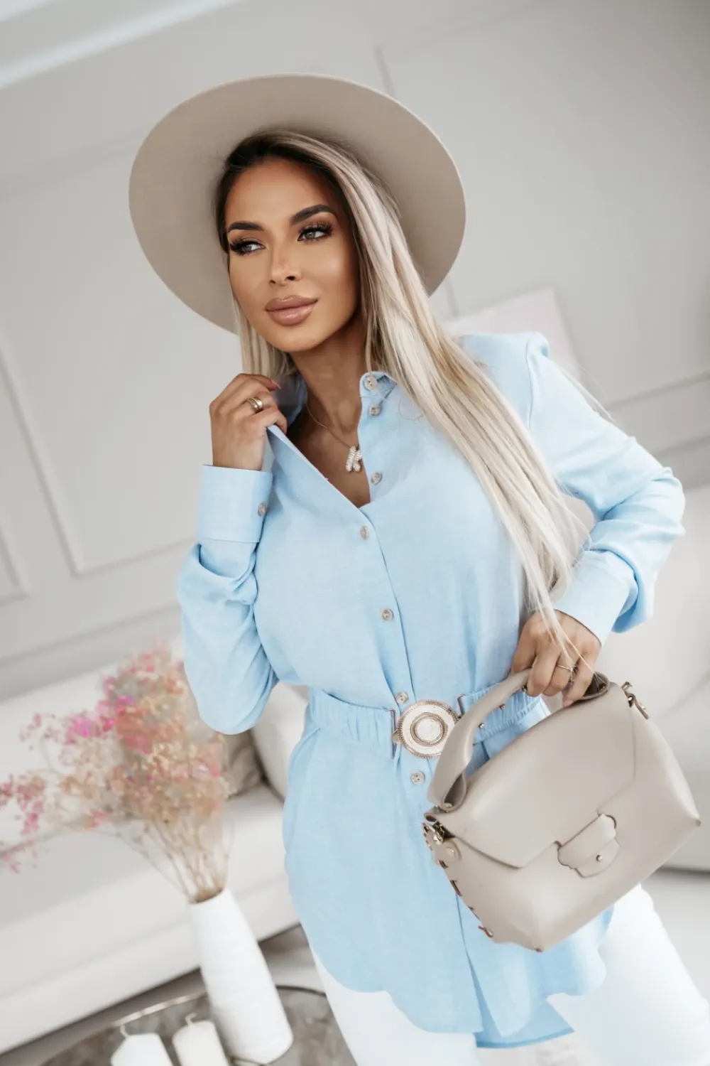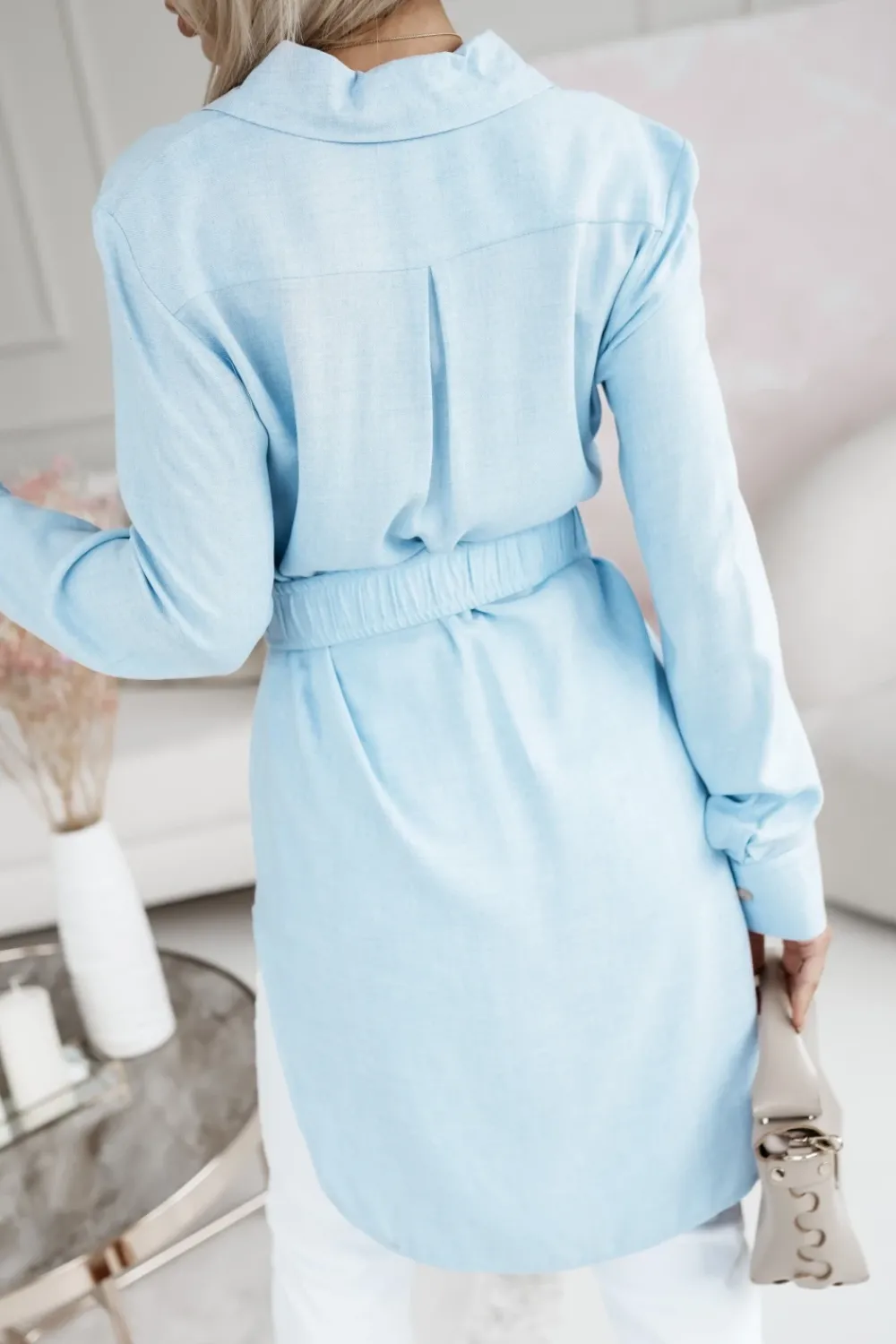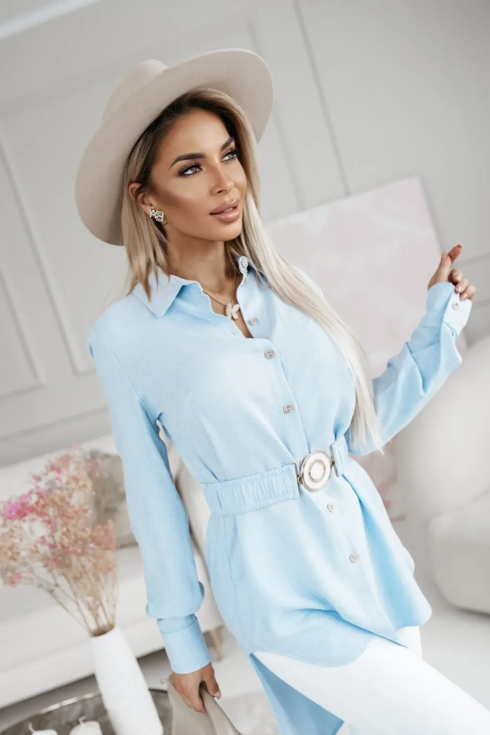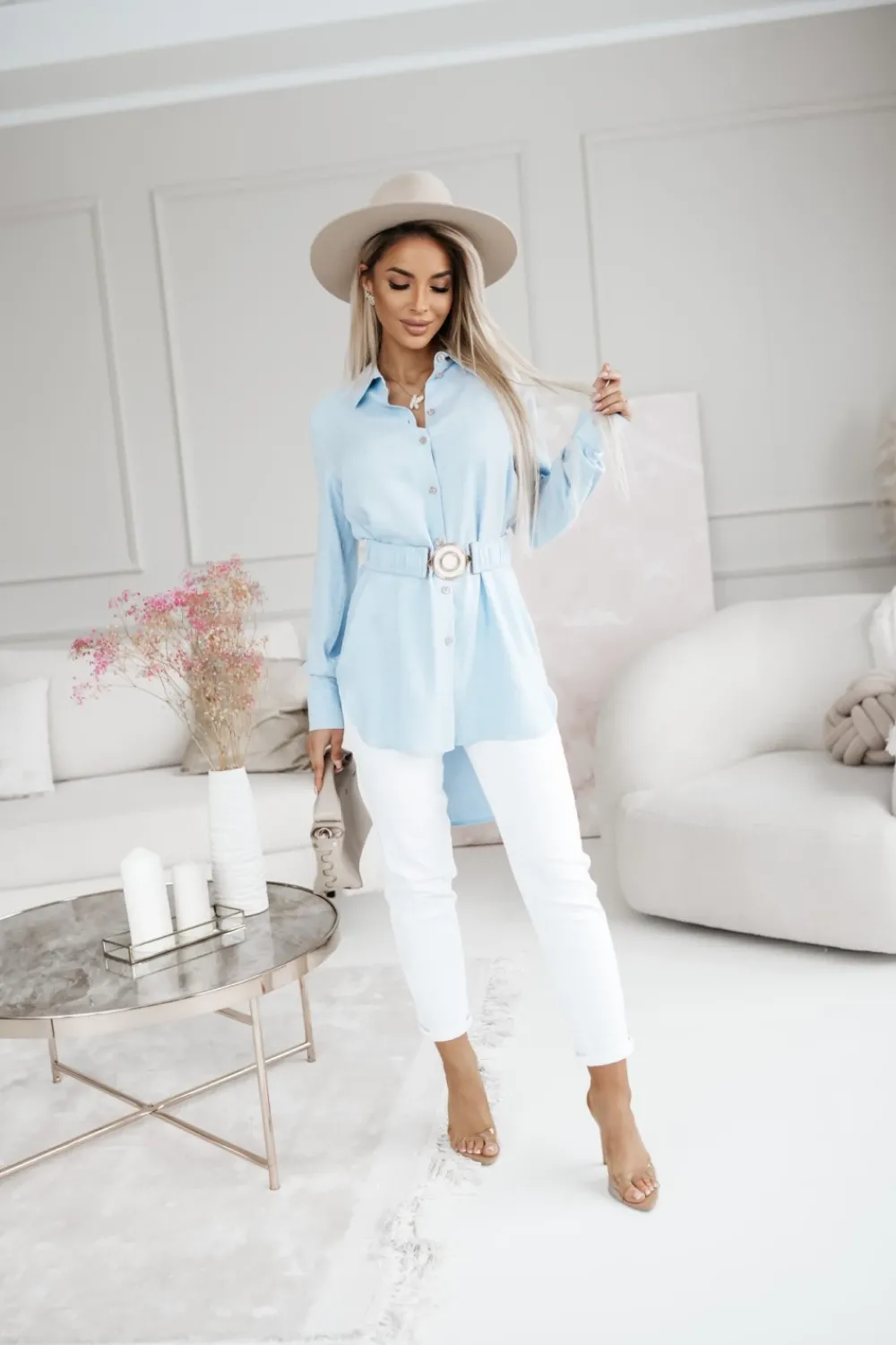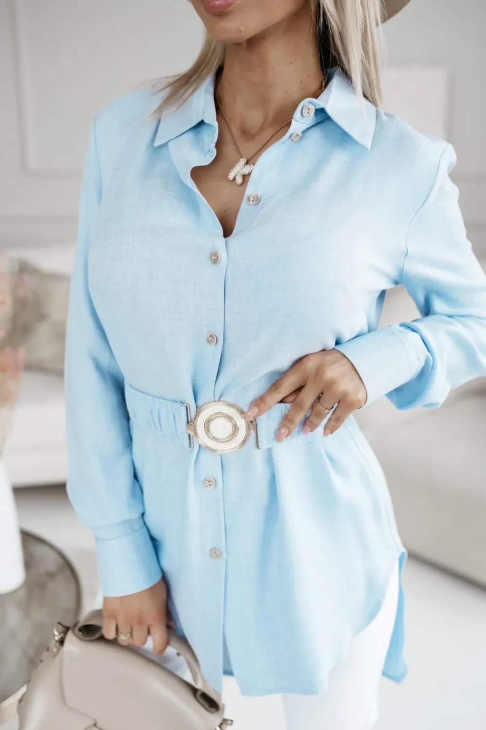 Tunika koszulowa o prostym kroju z asymetrycznym dołem, który dodaje jej nowoczesnego charakteru. Zapinana na guziki, z klasycznym kołnierzykiem, długim rękawem zakończonym rozpinanym mankietem. Dodatkowo pasek na gumce z ozdobną klamrą podkreśla talię, nadając tunice elegancji i wyjątkowego stylu. Idealna do codziennych, jak i bardziej formalnych stylizacji.