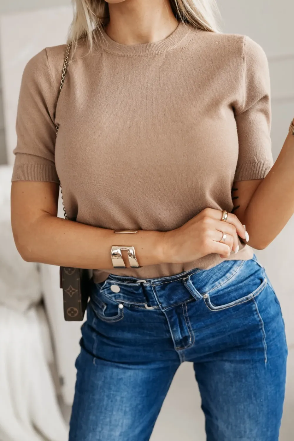 Klasyczny dopasowany sweterek. Wykonany z miłego w dotyku materiału. Posiada krótki rękaw oraz okrągły dekolt. Uroku dodają mu ozdobne, złote napy z tyłu. Świetnie będzie wyglądać zarówno w casualowej, jak i bardziej eleganckiej stylizacji.