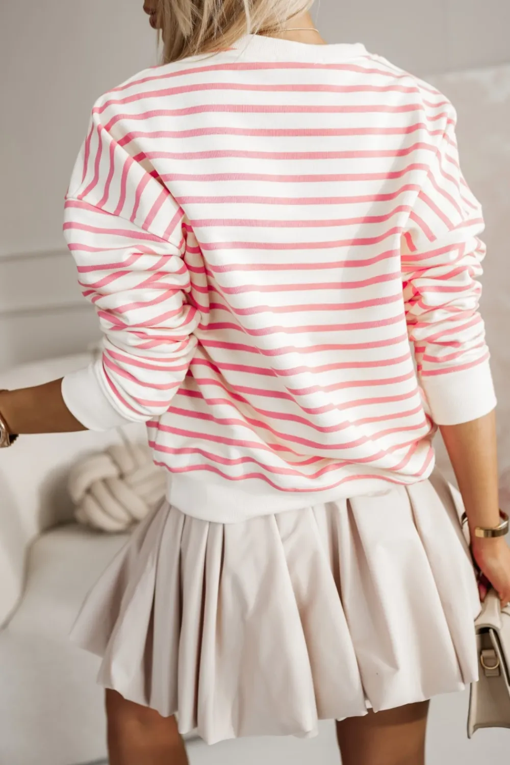Bluza oversize z okrągłym dekoltem to must-have w każdej szafie. Luźny krój zapewnia wygodę, a długi rękaw i dół wykończony ściągaczem nadają jej klasyczny, ale modny wygląd. Brak ocieplenia sprawia, że jest to idealny wybór na cieplejsze dni lub jako warstwa do innych stylizacji w chłodniejsze dni. Doskonała do casualowych outfitów, świetnie łączy się z dżinsami, joggerami czy spódnicami, tworząc komfortowy i stylowy look.