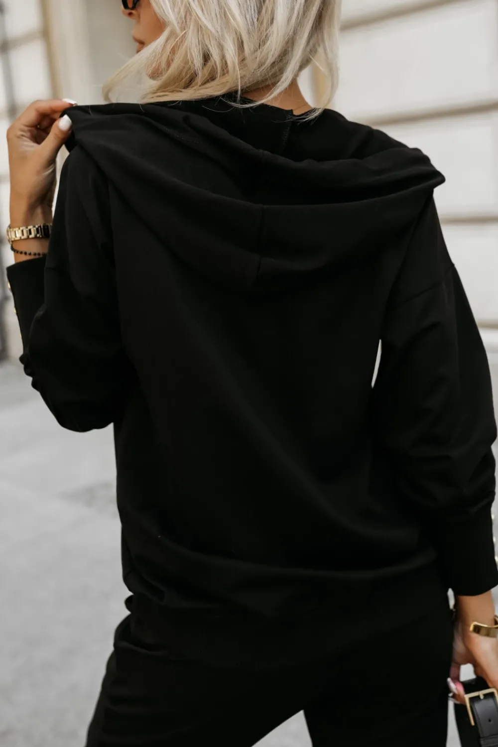 Bluza z kapturem i troczkami, zapinana na suwak, to idealny wybór na chłodniejsze dni. Posiada kieszenie z przodu, które dodatkowo ozdobione są dekoracyjnymi guzikami, dodającymi jej unikalnego charakteru. Zarówno dół bluzy, jak i końce rękawów ozdobione guzikami, wykończone są ściągaczami, które nie tylko zapewniają komfort noszenia, ale również podkreślają stylowy wygląd. Bluza łączy w sobie funkcjonalność i modny design, będąc doskonałym uzupełnieniem każdej casualowej garderoby.