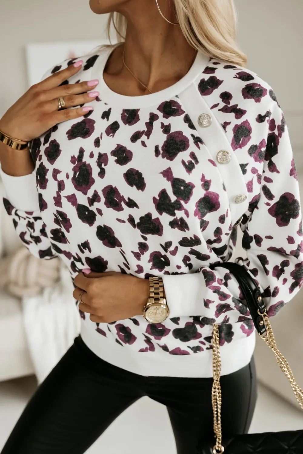 Stylowa bluza sweterkowa o klasycznym kroju, z okrągłym dekoltem, która łączy wygodę z eleganckimi detalami. Długi rękaw oraz dół wykończone są ściągaczem, co zapewnia komfortowe dopasowanie. Na przodzie znajduje się ozdobny akcent w postaci czterech dekoracyjnych guzików, dodających całości subtelnej elegancji. Idealna do codziennych stylizacji, łącząca prostotę z modnym wykończeniem.
