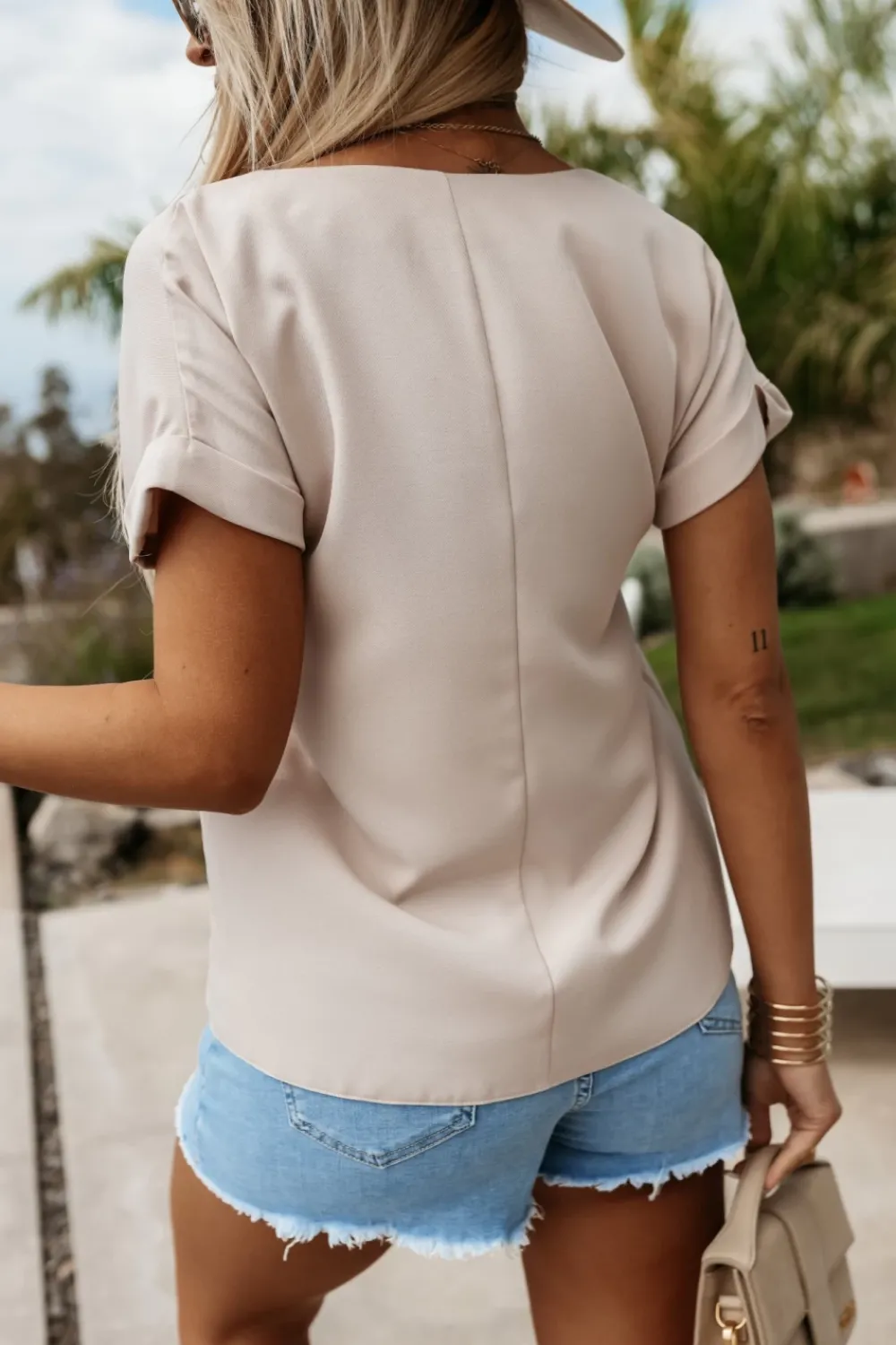 Elegancka bluzka o prostym kroju. Posiada dekolt w serek oraz krótki rękaw zakończony podwinięciem. Wykonana jest z dobrej jakości, mało elastycznego materiału. Pasuje zarówno do stylizacji formalnych jak i casualowych.