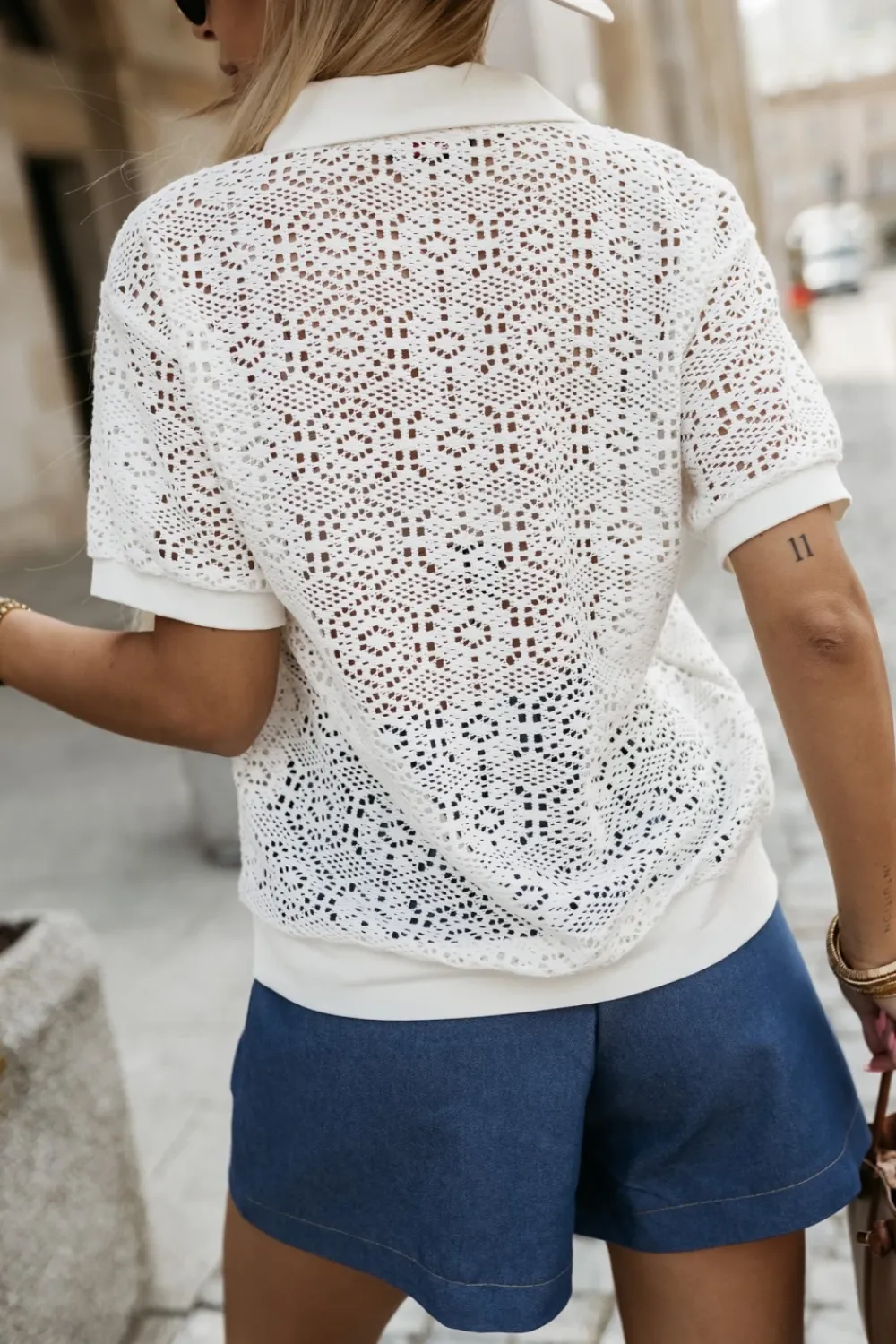 Bluzka ażurowa z krótkim rękawem i klasycznym kołnierzykiem, zapinana na trzy ozdobne guziki. Delikatny, przewiewny materiał w ażurowy wzór nadaje jej lekkości i kobiecego uroku. Idealna do letnich stylizacji – świetnie komponuje się zarówno ze spodniami, jak i spódnicą.