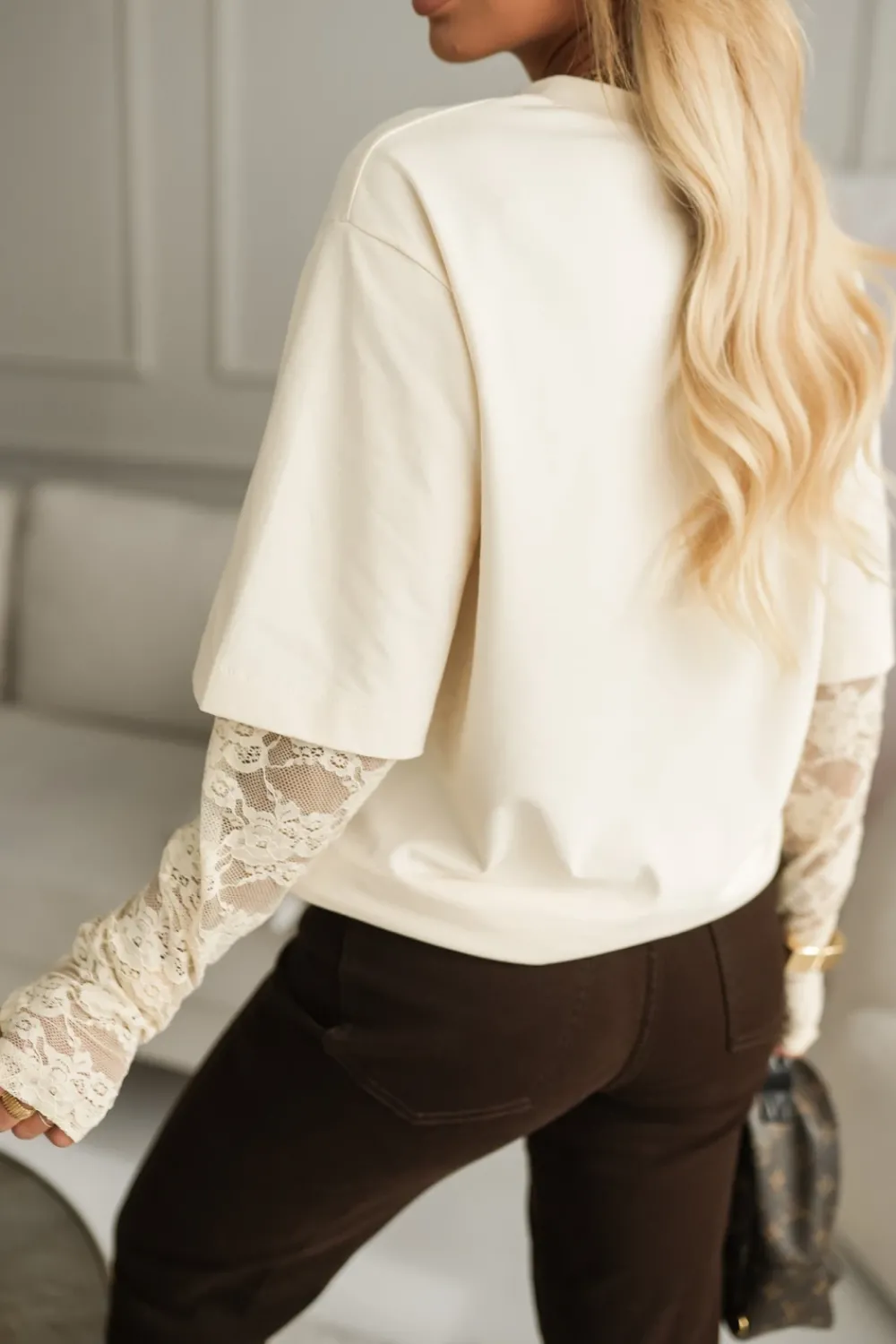 CandyTM BLUZKA BASIC BAWEŁNIANA Z KORONKOWYMI RĘKAWAMI KOKOSOWA