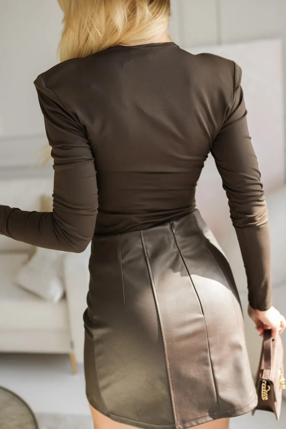 CandyTM BLUZKA BASIC Z GŁĘBOKIM DEKOLTEM Z PODUSZKAMI NA RAMIONACH CZEKOLADOWA