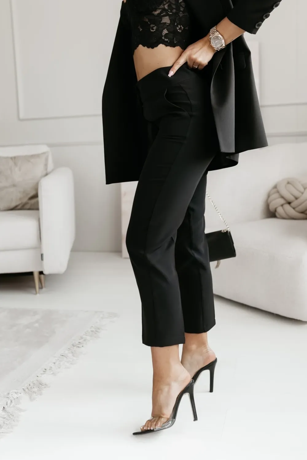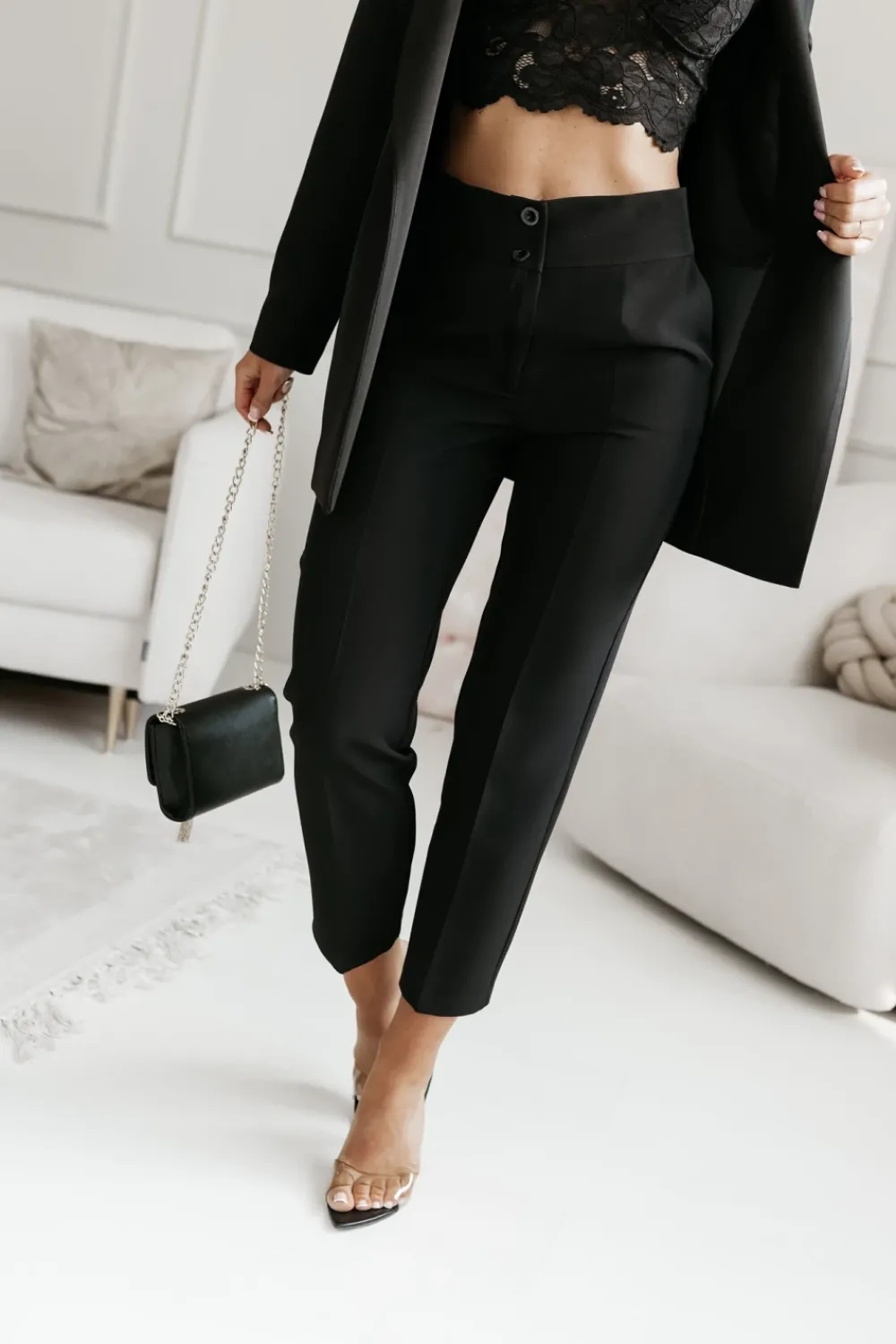 Eleganckie spodnie materiałowe o klasycznym kroju, idealne na formalne okazje oraz do biurowych stylizacji. Charakteryzują się wysokim stanem, który podkreśla talię i optycznie wydłuża nogi. Zapinane na dwa guziki oraz zamek, co gwarantuje wygodę i elegancki wygląd. Proste nogawki w kant nadają ponadczasowy szyk, a boczne kieszenie dodają praktyczności bez utraty elegancji. Świetnie komponują się z koszulami, marynarkami oraz klasycznymi szpilkami, tworząc stylowy i profesjonalny look.