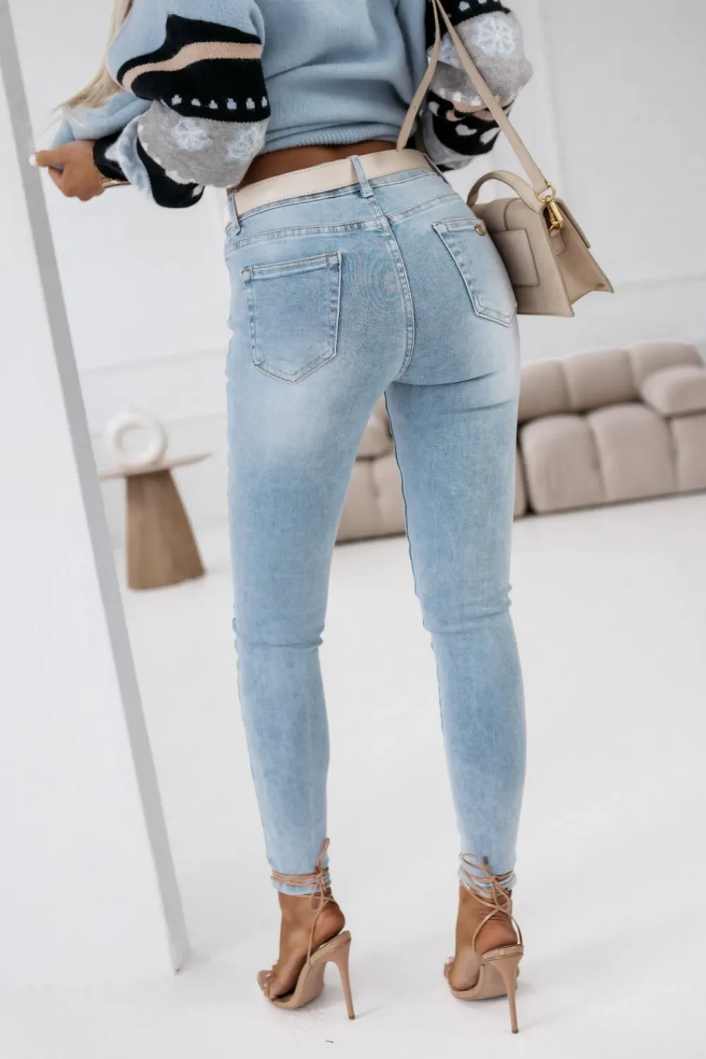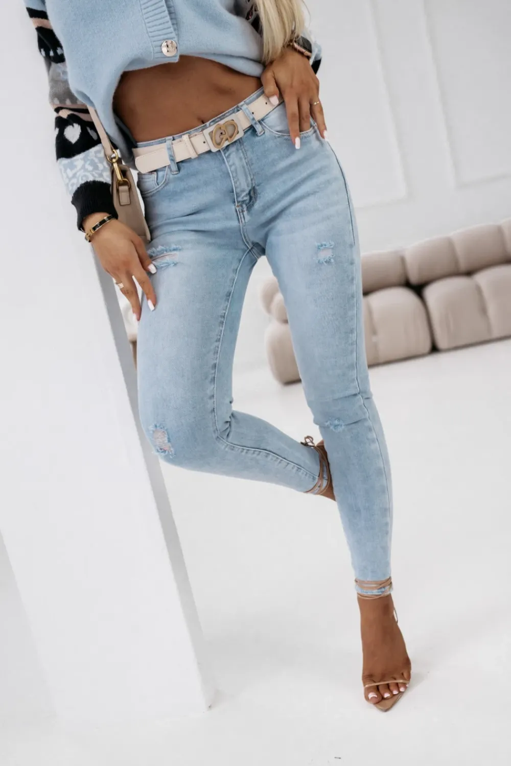 Jeansy skinny o średnim stanie, z delikatnymi dziurami z przodu, które nadają im modny, lekko rockowy wygląd. Wykonane z elastycznego denimu, idealnie dopasowują się do sylwetki, podkreślając jej kształty, jednocześnie zapewniając wygodę noszenia. Wyposażone w klasyczne zapięcie na guzik i zamek oraz szlufki i pasek, dzięki którym można je łatwo dopasować do własnych preferencji. Detal w postaci przywieszki na tylnej kieszeni dodaje im charakteru i wyróżnia je spośród innych modeli. Te jeansy to must-have w każdej garderobie, świetnie komponujące się z casualowymi i półformalnymi stylizacjami.