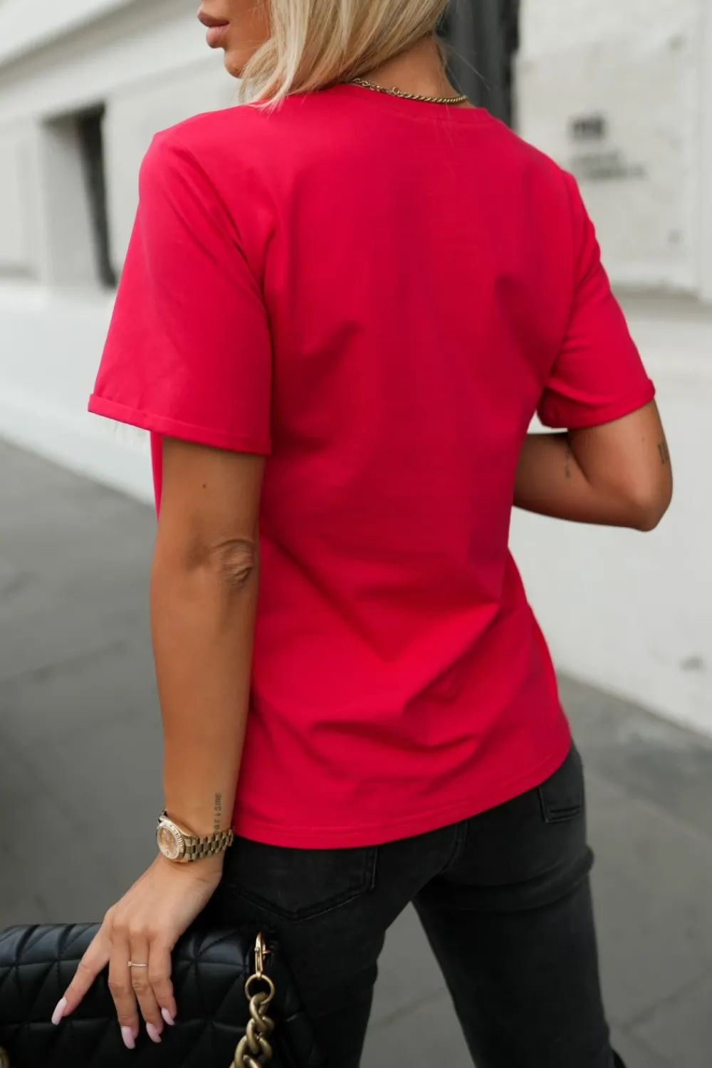 T-shirt z krótkim rękawem, który jest lekko podwinięty, nadaje całości casualowego, swobodnego charakteru. Z przodu znajduje się kieszonka, ozdobiona przypinką, co wprowadza subtelną, ale interesującą ozdobę. T-shirt ma prosty krój, który zapewnia komfort i uniwersalność, sprawiając, że jest to świetny wybór do codziennych stylizacji. Doskonale komponuje się zarówno z jeansami, jak i bardziej sportowymi spodniami, dodając luźnego, ale modnego akcentu.