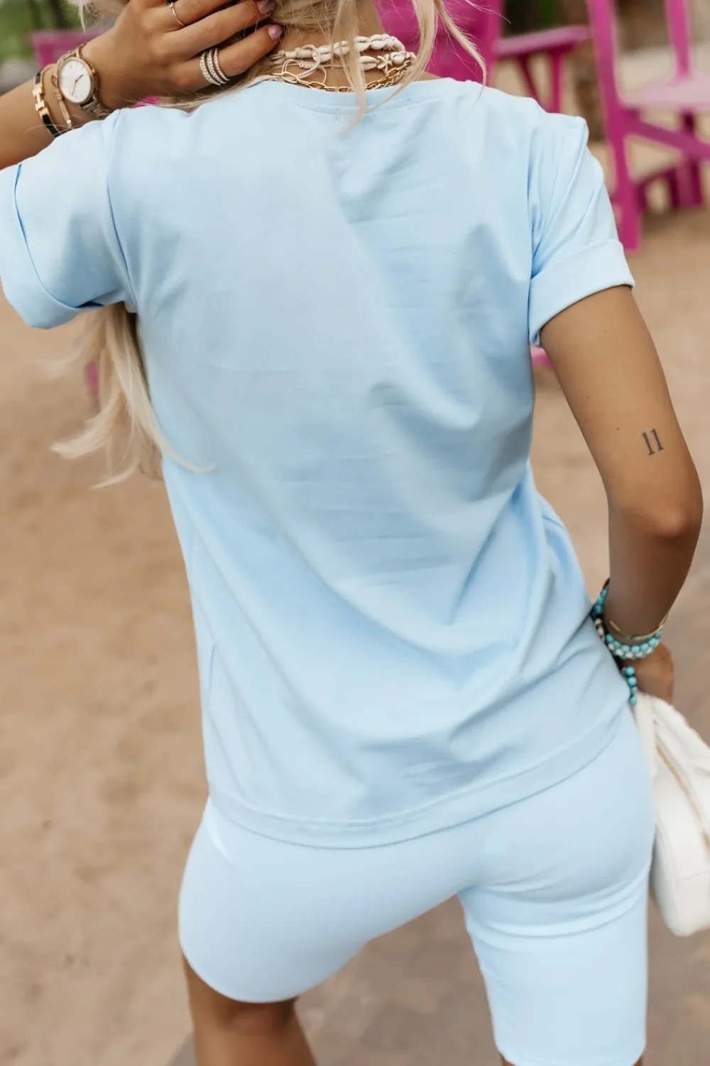 Minimalistyczny, a jednocześnie pełen uroku T-shirt z klasycznym okrągłym dekoltem. Wykonany z miękkiej, przyjemnej w dotyku tkaniny, świetnie sprawdzi się w codziennych stylizacjach. Podwinięte rękawy nadają mu swobodnego, stylowego wyglądu. Subtelny nadruk z kwiatkiem umieszczony tuż przy dekolcie dodaje całości delikatnego, dziewczęcego akcentu. Idealny do jeansów, spódnicy lub szortów – bazowy element garderoby z charakterem.