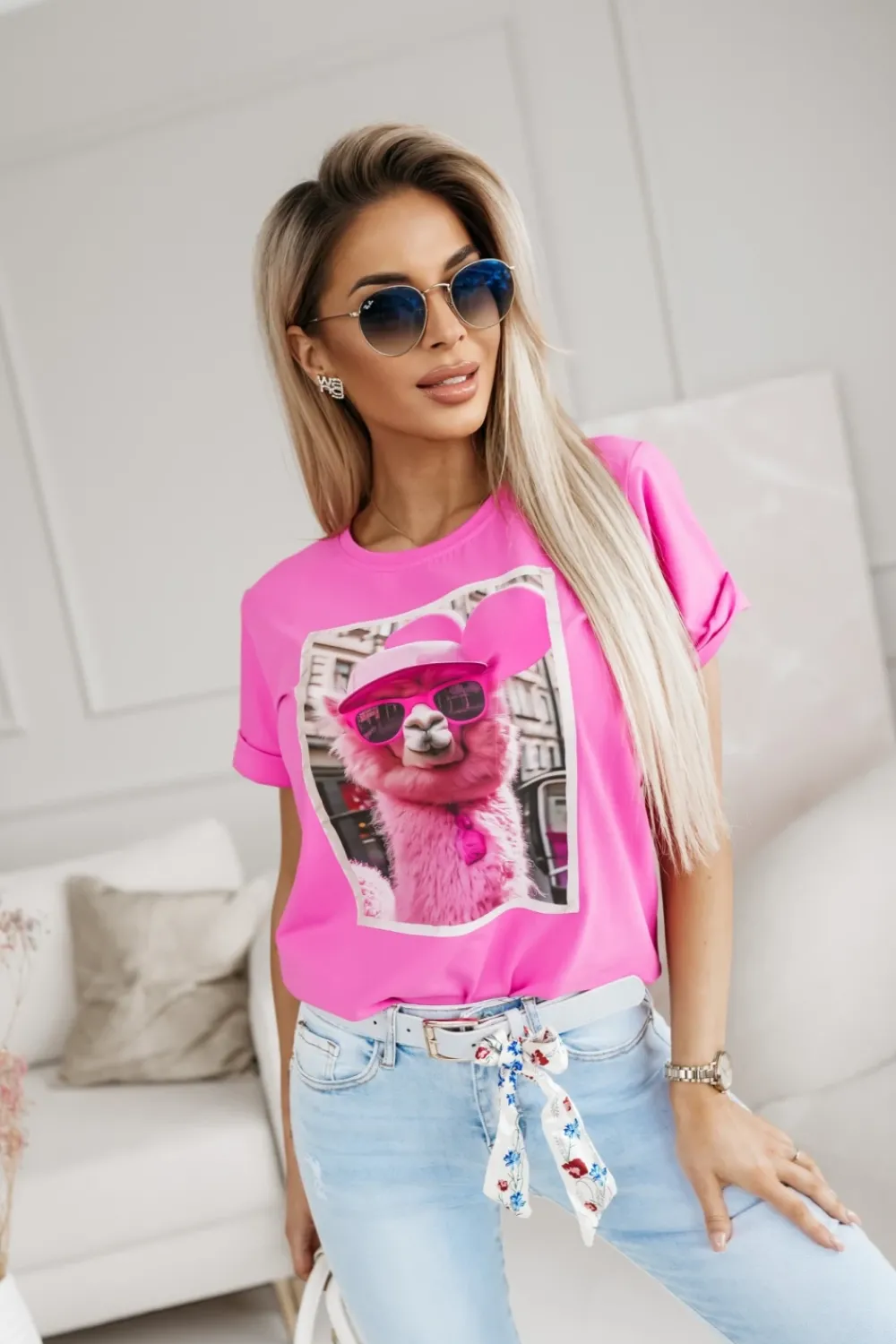 CandyTM T-SHIRT BAWEŁNIANY Z NADRUKIEM LAMA W CZAPCE MOCNY RÓŻ