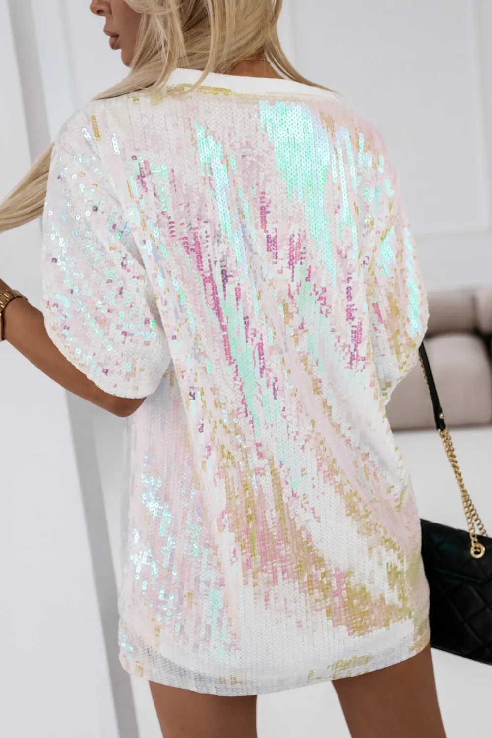 Cekinowa tunika z krótkim rękawem i okrągłym dekoltem, która idealnie łączy elegancję z młodzieżowym urokiem. Wzór z przodu przedstawia uroczego renifera oraz śnieżynki, co sprawia, że tunika staje się idealnym wyborem na zimowe dni i okres świąteczny. Dzięki podszewce zapewnia komfort noszenia, a cekiny dodają jej blasku i wyjątkowego charakteru. Świetna na wieczorne wyjścia, spotkania ze znajomymi lub świąteczne celebracje, nadając stylizacji niepowtarzalnego, festiwalowego klimatu.
