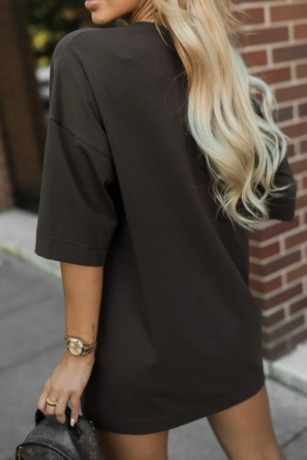 Dłuższy t-shirt oversize o swobodnym, komfortowym kroju, który zapewnia pełną wygodę noszenia i wpisuje się w nowoczesne, streetwearowe trendy. Klasyczny okrągły dekolt podkreśla casualowy charakter, a na środku znajduje się wyrazisty nadruk z psem oraz napisem „doberman”, który dodaje całości mocniejszego, nieco rockowego akcentu. Doskonale sprawdzi się w codziennych stylizacjach – zarówno do legginsów, jak i do jeansów.
