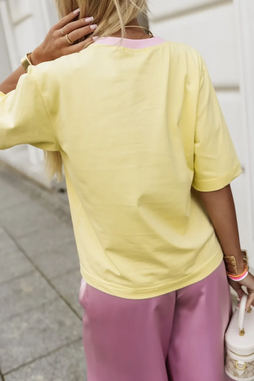 T-shirt z krótkim rękawem, wykonany z miękkiej dzianiny. Na środku subtelny nadruk kwiatka dodający delikatnego akcentu. Kontrastowy, prążkowany dekolt podkreśla sportowy charakter koszulki i dodaje jej wyrazistości. Idealny do codziennych stylizacji
