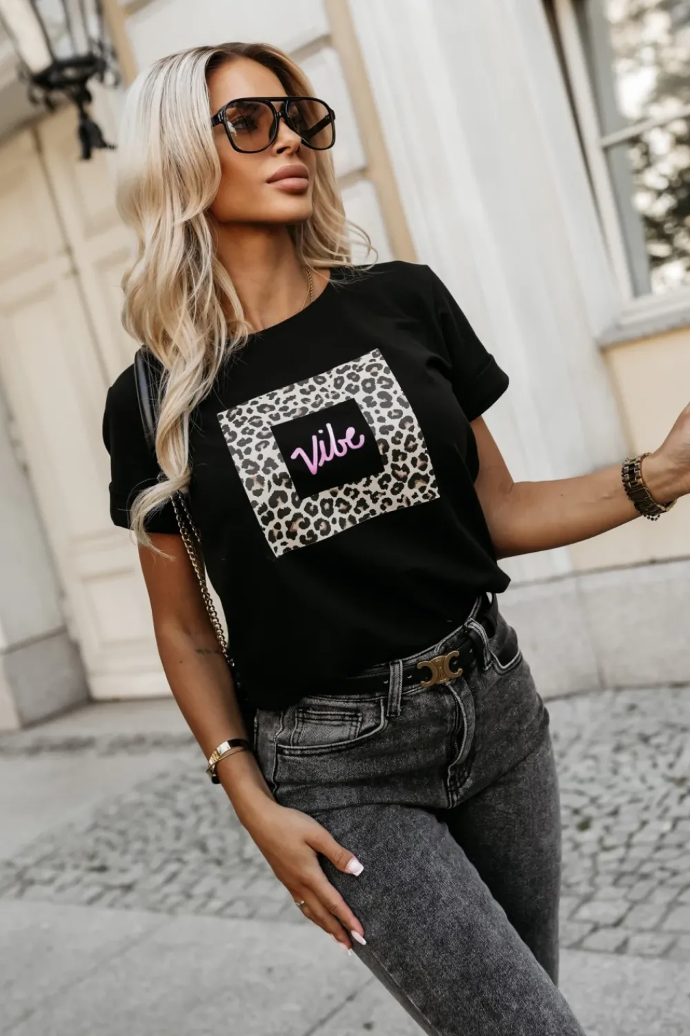 Stylowy t-shirt o prostym kroju, idealny na codzienne stylizacje. Posiada krótki, podwijany rękaw, co dodaje mu swobodnego, casualowego charakteru. Z przodu znajduje się panterkowy nadruk z napisem „Vibe”, która wprowadza modny, młodzieżowy akcent. Okrągły dekolt nadaje klasyczny, uniwersalny wygląd. Ten t-shirt doskonale sprawdzi się w połączeniu z jeansami czy szortami, tworząc wygodny i stylowy look na co dzień.